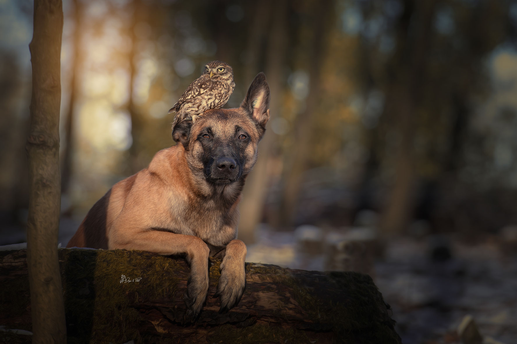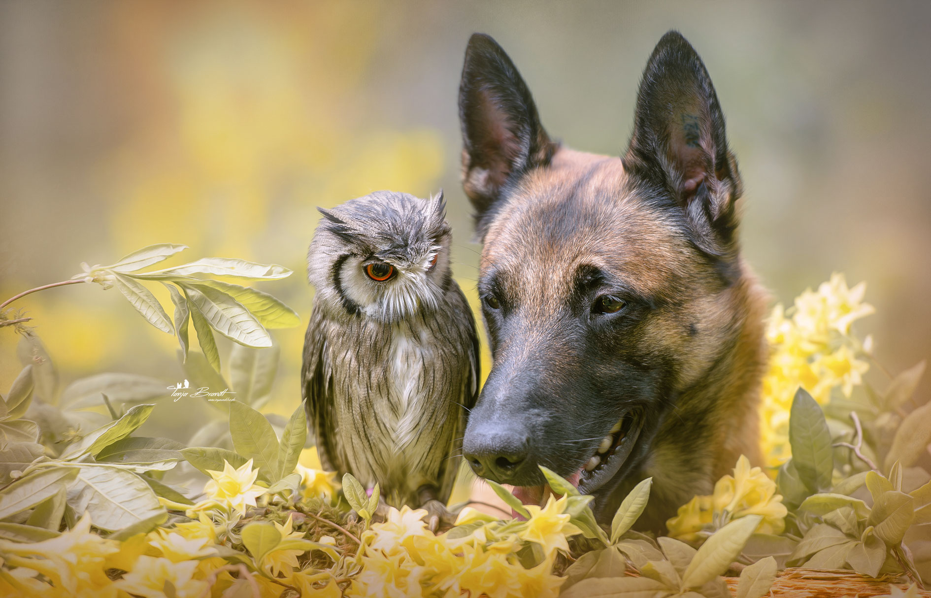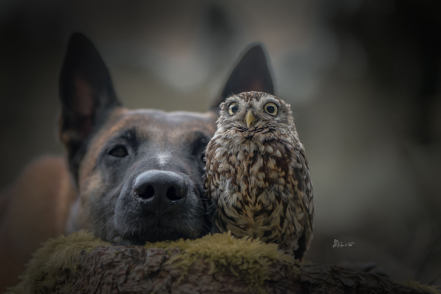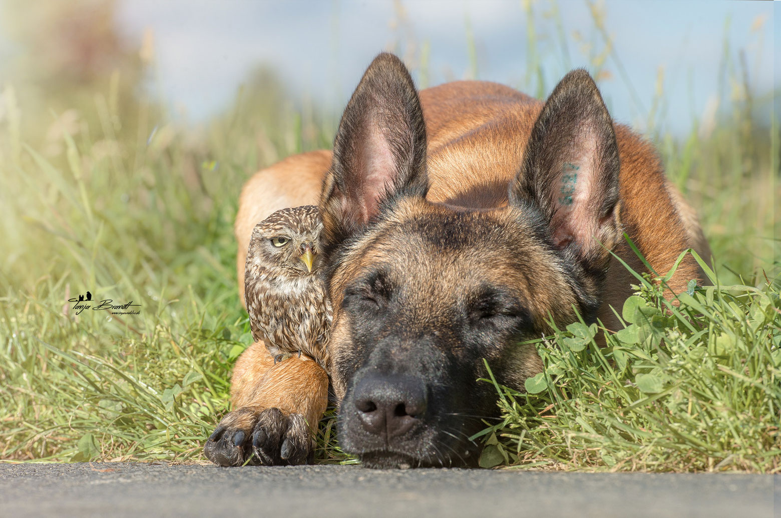 Recently, the German artist found a new challenge when she photographed the unique bond between two unlikely friends: Ingo, a Belgian Shepherd, and Poldi (Napoleon), a one-year-old owlet.