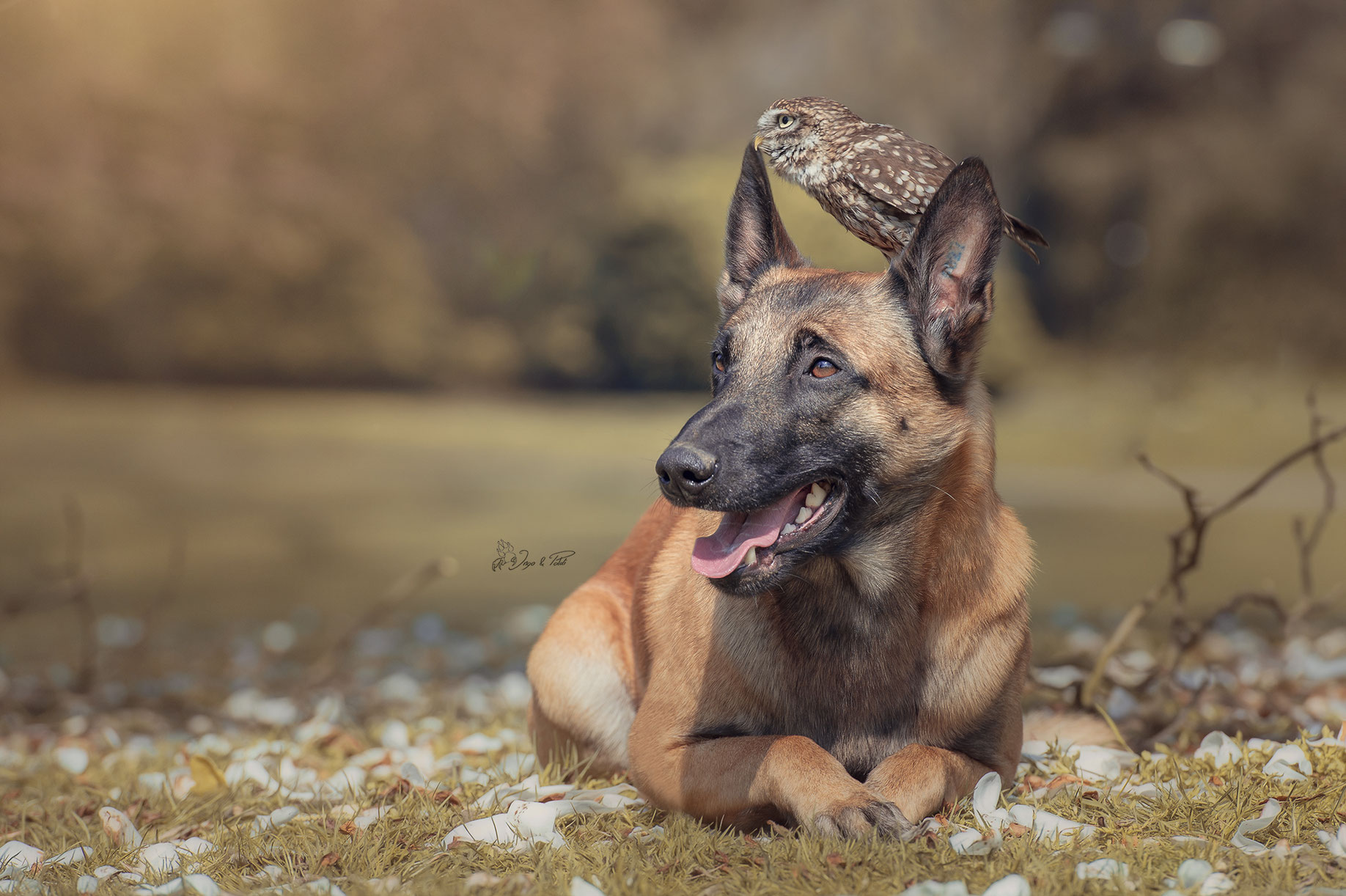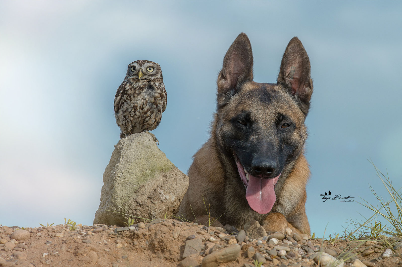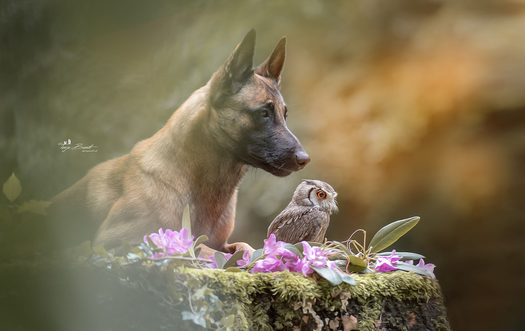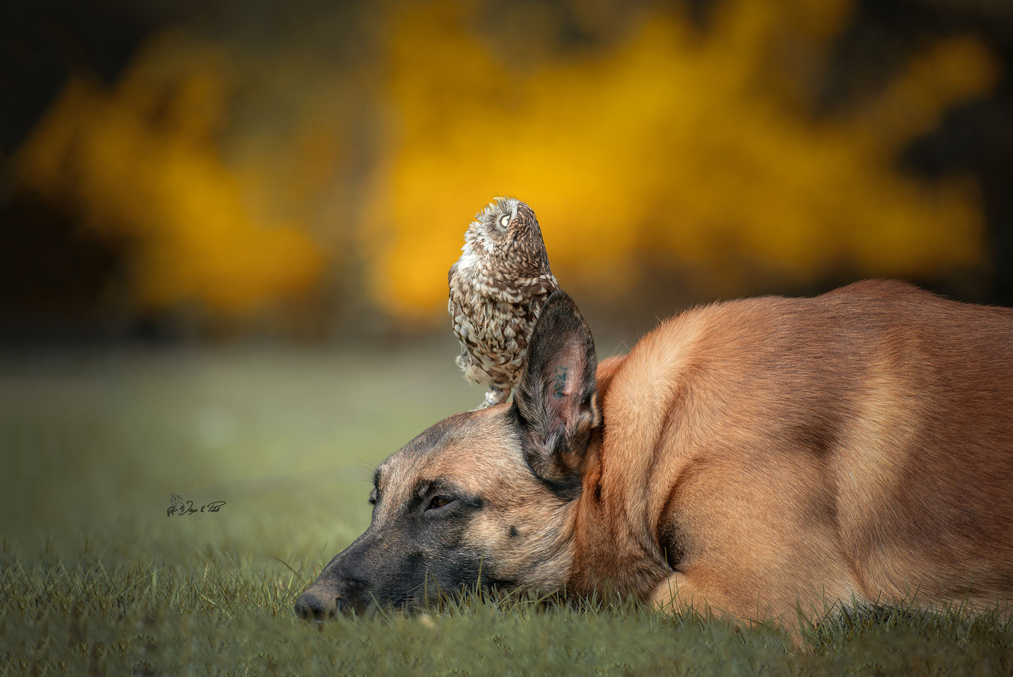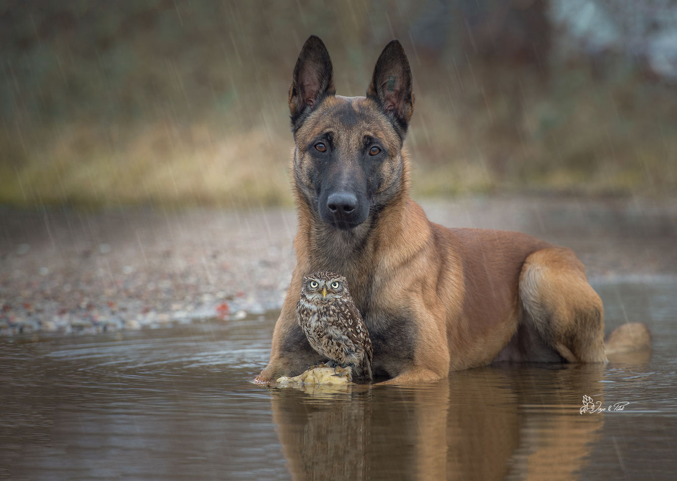 Recently, the German artist found a new challenge when she photographed the unique bond between two unlikely friends: Ingo, a Belgian Shepherd, and Poldi (Napoleon), a one-year-old owlet.