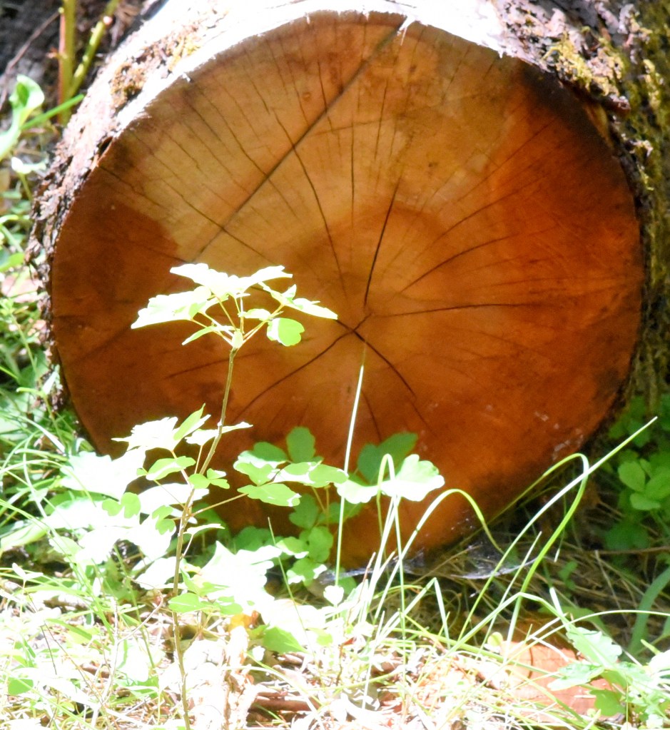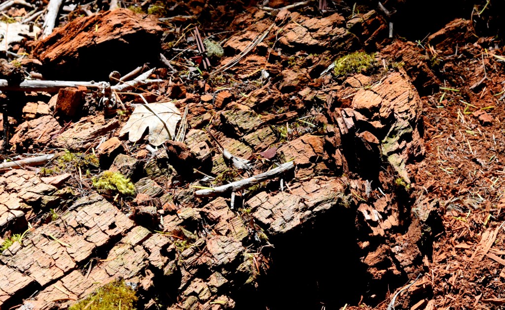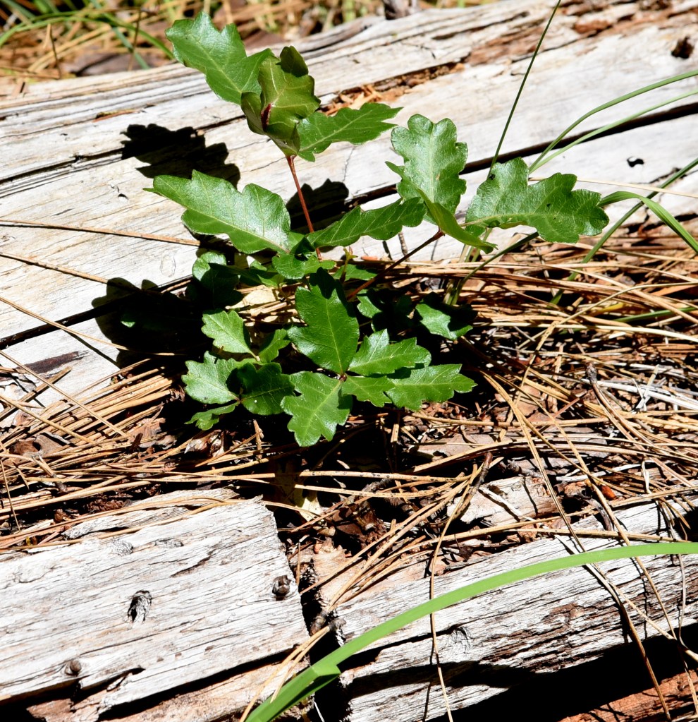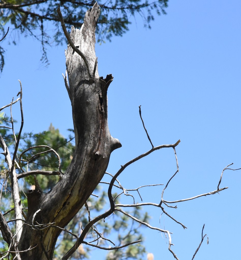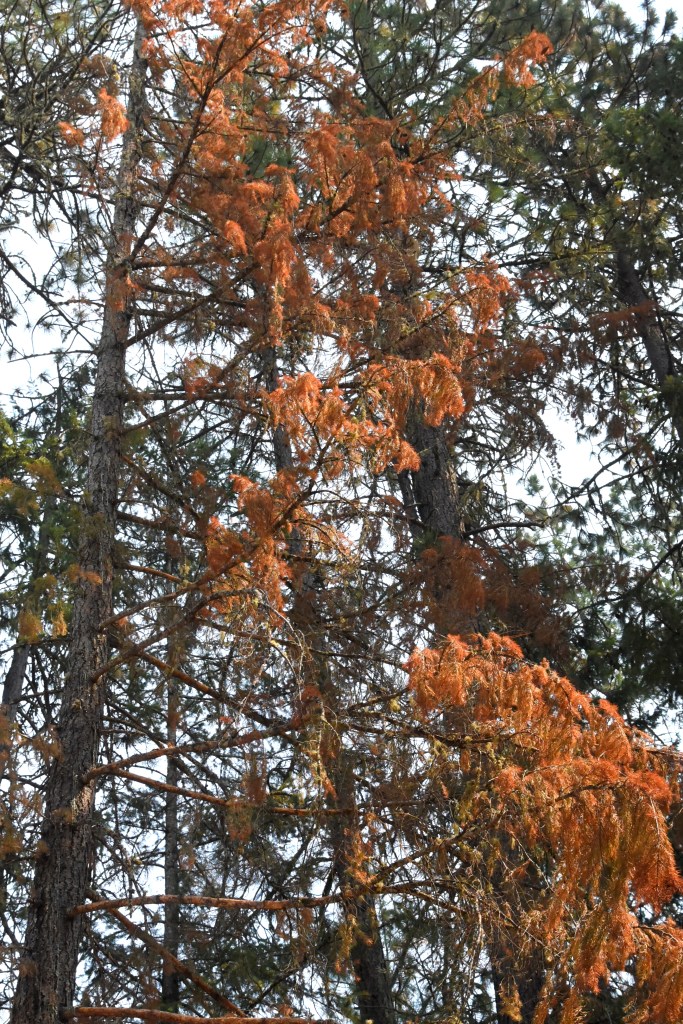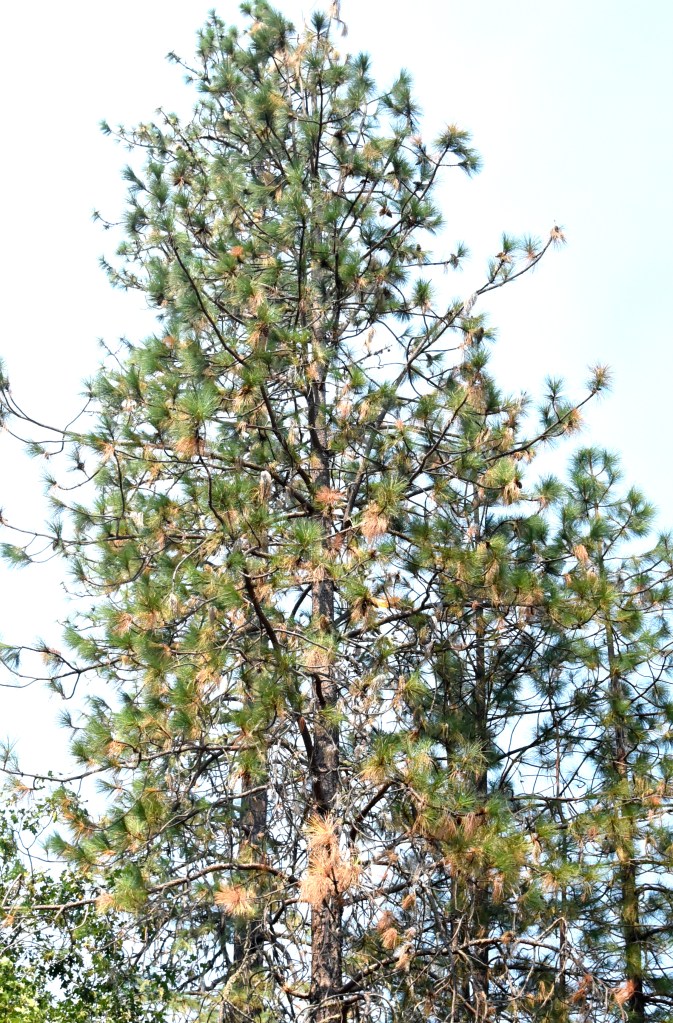 Now in stark contrast look at the trees in the photo below. (Oh, that’s the smoky summit of Mount Sexton, elevation 3,829 ft., in the distance.)